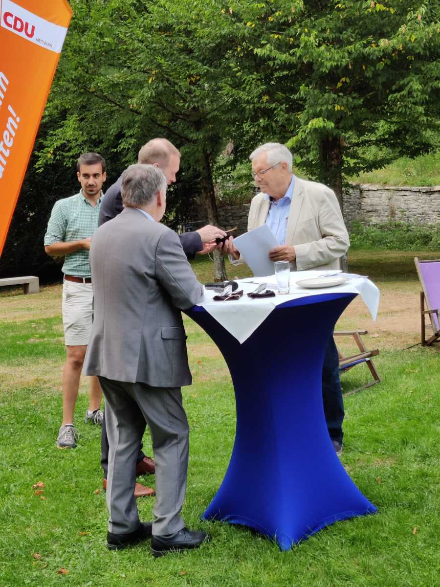 Der Innenminister des Landes NRW Herbert Reul freute sich, in diesem schönen Garten des Neanderthal Museums nicht nur bekannte Gesichter begrüßen zu dürfen, sondern auch langjährige Mitglieder für die Mitgliedschaft in der CDU Deutschland ehren zu können. Gemeinsam mit Herrn Dr. Heinisch und Herrn Röhr ehrte Herr Reul, Herrn Kortenhaus für 60-jährige Mitgliedschaft und Herrn Scherer für 40-jährige Mitgliedschaft in der CDU Deutschland. Herr Reul bedankte sich bei den Jubilaren für ihr Engagement und die langjährige Treue und Verbundenheit für die CDU.